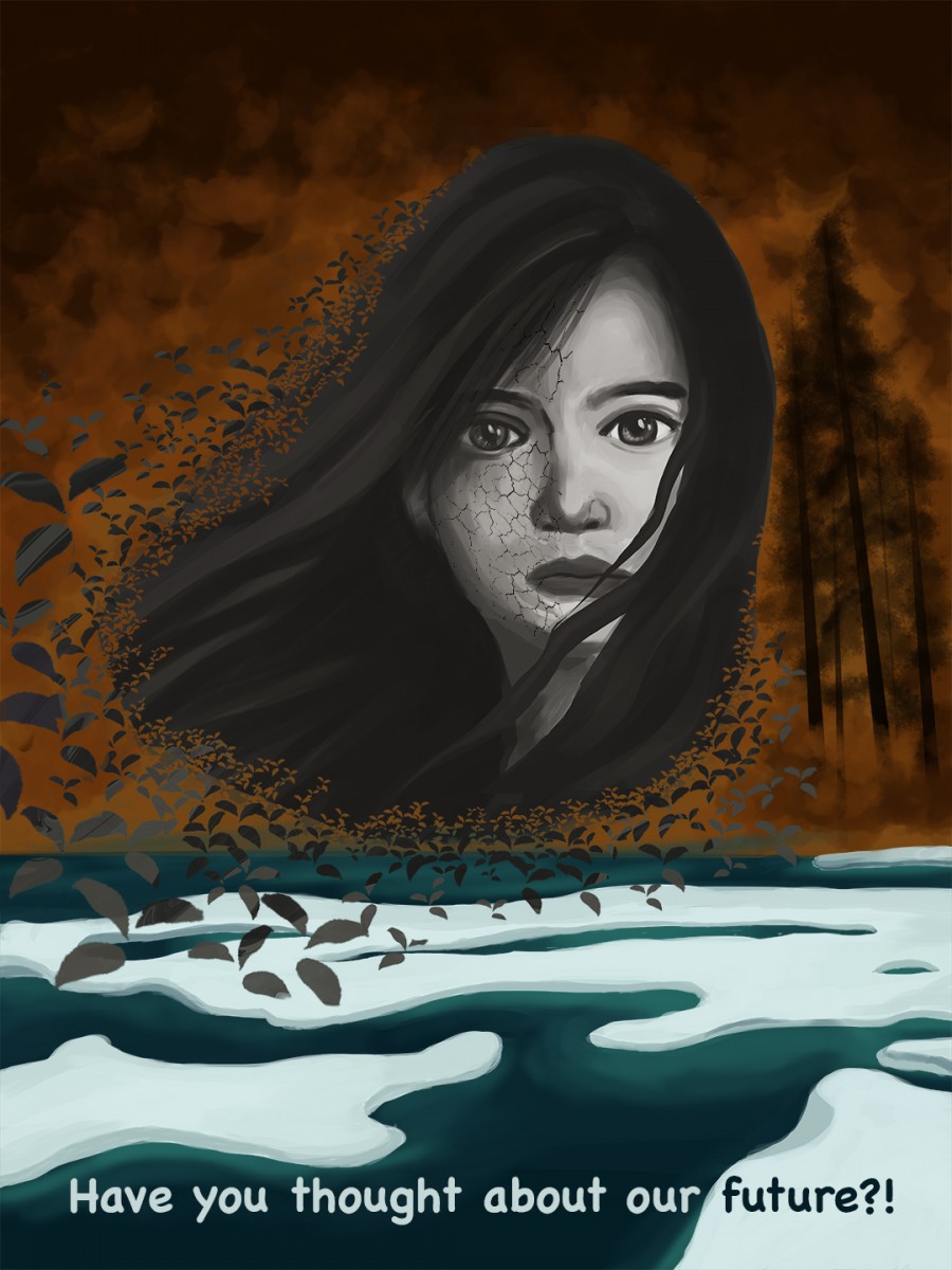 Climate change is going to affect the future generations on an enormous scale. And the previous generations are either unaware, ignorant or even worse choose to not believe. This piece shows the melting polar ice caps and forest fires, with a younger generation girl. The girl's future is slowly disintegrating and initiates a dialogue to think about our future.
